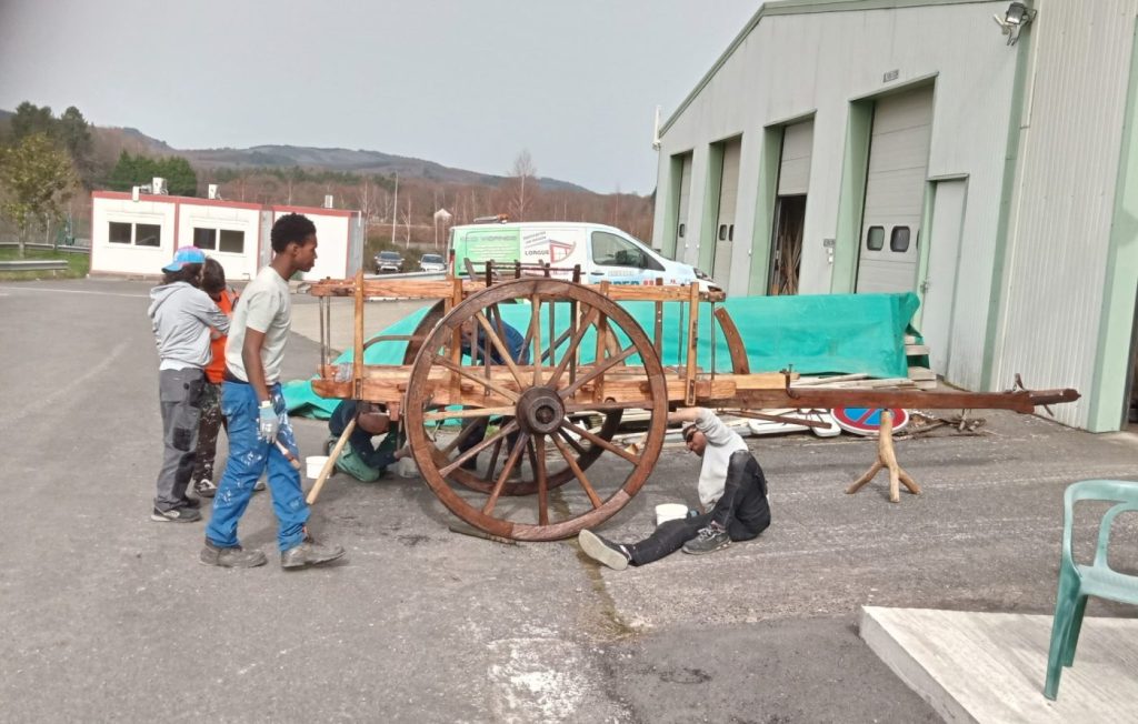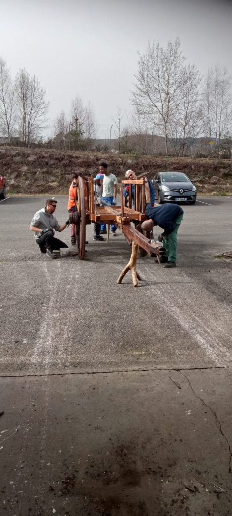 Les jeunes adultes de l’Institut Médico-Éducatif (IME) de Saint Laurent les Églises, dans le cadre de l’atelier « Hors Murs » dont nous avons déjà parlé (montage d’étagères au gymnase, chalet et rennes du Père Noël…) ont également participé de façon active à la réalisation de l’aménagement autour des murs en pierres sèches, montés par nos services techniques : la carriole, récupérée gracieusement contre bon soin, se trouvait dans un sale état (proche de l’Ohio, comme chante Isabelle Adjani) et les décapages des parties en bois et en ferrailles n’ont pas été une mince affaire ! ! La peinture aussi a nécessité quelques heures de travail puis de patience et de séchage au soleil !