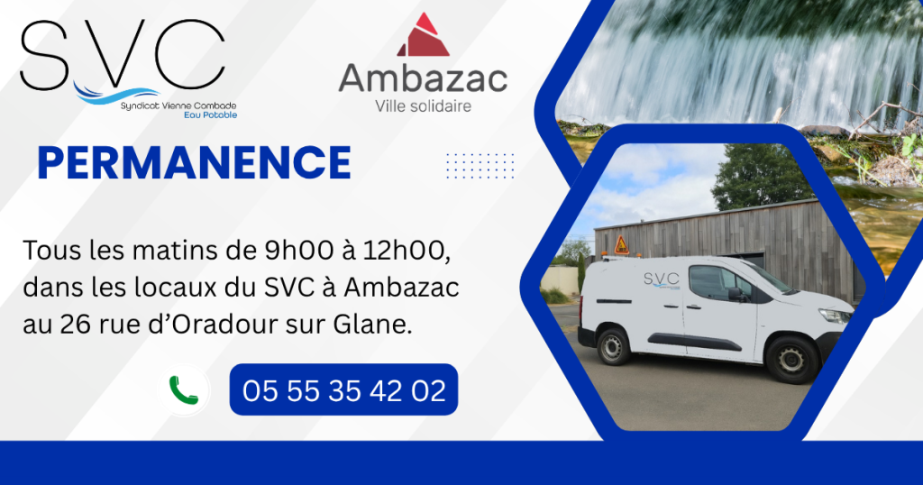 Cécile vous reçoit tous les jours de 9h à 12h, dans les locaux du SVC Ambazac, au 26 rue d’Oradour Sur Glane pour répondre à toutes vos questions concernant la délégation « EAU »