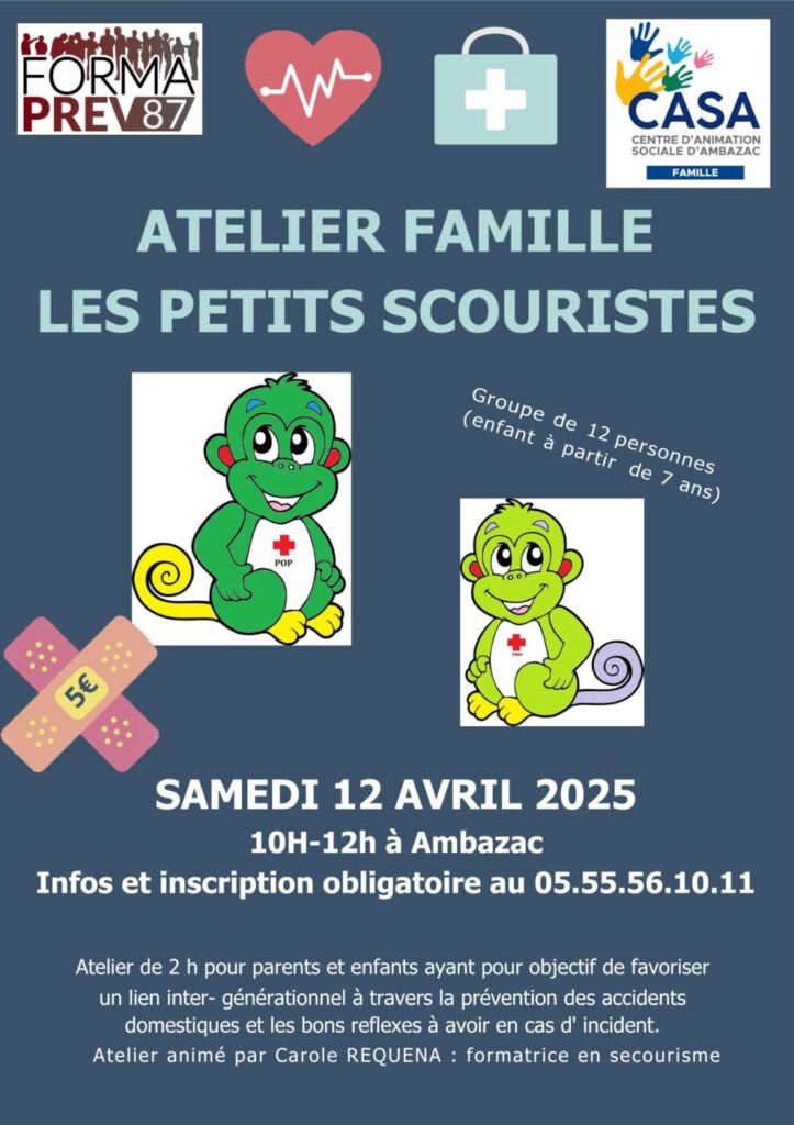 Le Centre d’Animation Sociale Ambazac propose dans le cadre de ses missions de soutien à la parentalité, un atelier « LES PETITS SECOURISTES », avec Carole REQUENA, 𝙡𝙚 𝙨𝙖𝙢𝙚𝙙𝙞 𝟭𝟮 𝙖𝙫𝙧𝙞𝙡, 𝙙𝙚 𝟭𝟬𝙝 𝙖̀ 𝟭𝟮𝙝.
