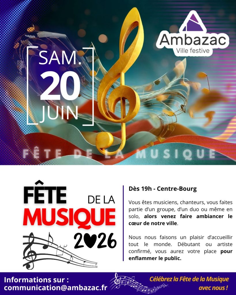 Comme chaque année, Ambazac fêtera la musique le samedi 20 juin à partir de 19h00, dans tout le centre bourg.